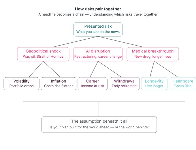 The risks being presented to you on television are not the same as the risks sitting in your financial life. Geopolitical risk, the Strait of Hormuz, oil prices, get translated into market volatility, which then creates pressure on your longevity assumptions, which compounds into long-term care cost projections you never updated. The presented risk is a headline. The real risk is what that headline means for your family ten and twenty years from now.