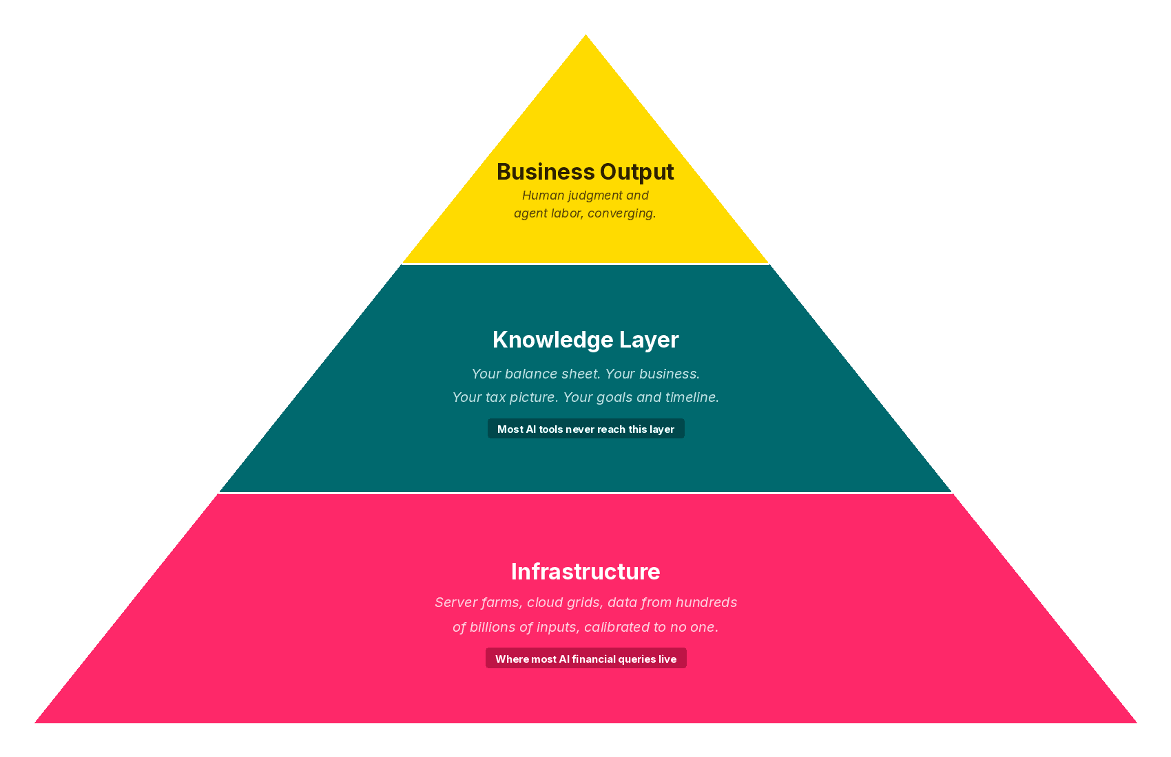 This diagram is something I shared with clients at our last quarterly review. Look at the layers. Infrastructure at the bottom. Knowledge layer in the middle. Business output at the top, where human and agent labor converge. Most people accessing AI for financial decisions are touching the bottom layer only. The knowledge layer, the one that would actually know their life, doesn't exist for them. And they can't tell the difference, because the output sounds so good.
